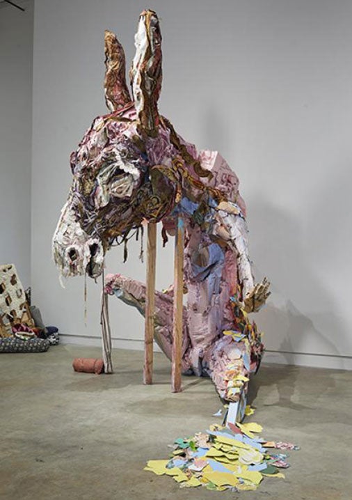 Her work evolved, and she moved into sculptures made from found objects, art for which she is well known today. That later work, which has been exhibited throughout the United States and Canada, shows almost mythological characters in bright colors that are giant — 6-foot-tall coyotes and 11-foot-tall mules and cattle. The creatures are made from trash and thrift store discards. Old crocheted afghans, quilt pins, rope, pillows and bedclothes, sometimes dipped in liquid clay, or slip, to stiffen them, make their way into her sculptures. She scavenges reject paint from big box stores to top it all off. She also uses Styrofoam as a primary, base material to craft the huge objects, making her work lighter than a lot of sculpture, and easier to move, she added. “And I feel good that I’m using it. It just goes to waste, otherwise,” she said of the Styrofoam that she often finds near large community trash bins. The stunned donkeys and sweet cows are often described as “scruffy.” The found objects of her construction poke out from bellies and hooves in a final product that is a far cry from her once smooth clay. A recent exhibition at the Charlie James Gallery in Los Angeles described her work as “Existing somewhere on a spectrum between elegy and absurdity, the work examines a setting where cautionary tales, private anxieties and natural history museum dioramas mash-up … and attempts to close the gap between tenderness and the grotesque. Through a feminist lens, O’Connor’s sculptures appear as something like a Where The Wild Things Are from a feminist imagination.” Higgins-O’Connor added this to the description of her work: “It is a way to convey my engagement in formal concerns, process, materiality and the marks and decisions left by my hand.” And, she said, “Everyone can identify with animals in some way.” Fitting, then, that her work is featured in a current exhibition, “Encounters: Honoring the Animal in Ourselves,” running through the end of the year at the Palo Alto Art Center. On a recent afternoon in the TB 9 classroom of beginning students, she was both counseling beginning sculptors and admiring their work — and telling a student who wasn’t feeling well to get some rest. “It’s very energizing to work with students,” she explained. “It’s so exciting to see them create — some of them for the first time. And then I get very juiced up about my own work.”