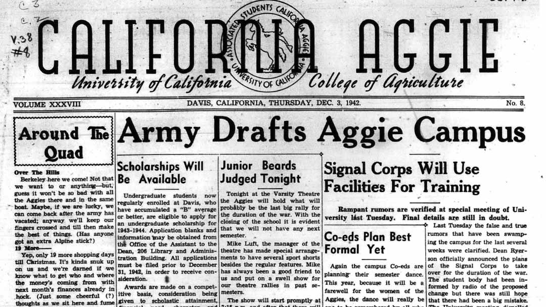 Picnic Day goes on despite World War I. The campus becomes an army training facility during World War II. The Memorial Union opens in 1955. Students protest apartheid and fight for animal rights in the 1980s. The California Aggie, founded as The Weekly Agricola in 1915 when UC Davis was still the University Farm, has captured each chapter in the university’s history through the eyes of student reporters. This fall, the UC Davis Library, home of the University Archives, launched an effort to digitize the complete archive of The Aggie from its first issue through today and make it searchable online. The web interface will allow readers to flip through issues online or search the full text by keyword. Users will also be able to print and download individual articles or entire issues. If you’re on campus, stop by Shields Library and check out the exhibit in the lobby, The California Aggie: A Century of Headlines.