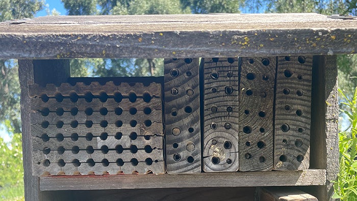Christine Casey, an educator and manager of the UC Davis Bee Haven, supervises a redwood block bee house in the Haven. “It’s really fun to see the bees come and go,” Casey said. Plants like the western redbud, California wild rose and lamb’s ear can be grown around the bee house to provide material and encourage activity, but she added, the decision about nest location is “mostly random.”