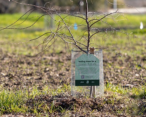 Where the Texas trees are planted on campus borrows science from another UC Davis-hosted experiment — a statewide project that coined the term “Climate-Ready Trees,” back in 2015. Alison Berry, professor emerita, is a lead researcher on this 20-year experiment testing 12 promising tree species for California cities, with a campus reference plot plus sites throughout the state.