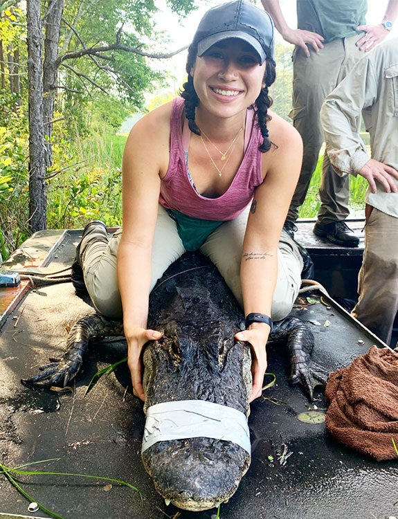 On yet another wet hot day in the Savannah River, the fearless Laura Kojima ’19 and her colleagues capture a hefty alligator for the second time. By now, he has a nickname: Jabba. Last time, they roped Jabba’s solid, shingled neck, pulled him to shore, measured his body, and took blood samples. This time, the behemoth seems to know the dance, acquiescing as they guide him to shore to take photographs. Kojima, who is pursuing a master’s degree at the Odum School of Ecology at the University of Georgia, said Jabba can help her analyze the prevalence of toxins from a nearby former nuclear reactor, and how the contaminants impact the way alligators move and behave in these waters.