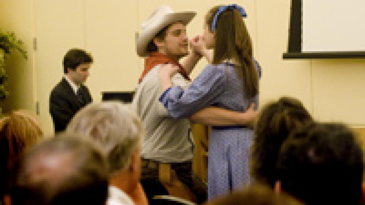 Tristan Rumery, a professional equity actor, and UC Davis student Emma Goldin performed before about 150 people at the Chancellor’s Laureates luncheon in the ARC ballroom on May 8. Rumery and Goldin were acting in the the UC Davis Centennial production of Oklahoma! that was showing at the Mondavi Center through May 10. Just a day after her official announcement, chancellor-designate Linda Katehi came to campus for a morning introduction and later attended the laureates’ luncheon and, in the evening, Oklahoma! The Chancellor’s Laureates comprises people and organizations who have been the leadership donors to UC Davis, with each Laureate cumulatively donating $1 million or more to campus programs.