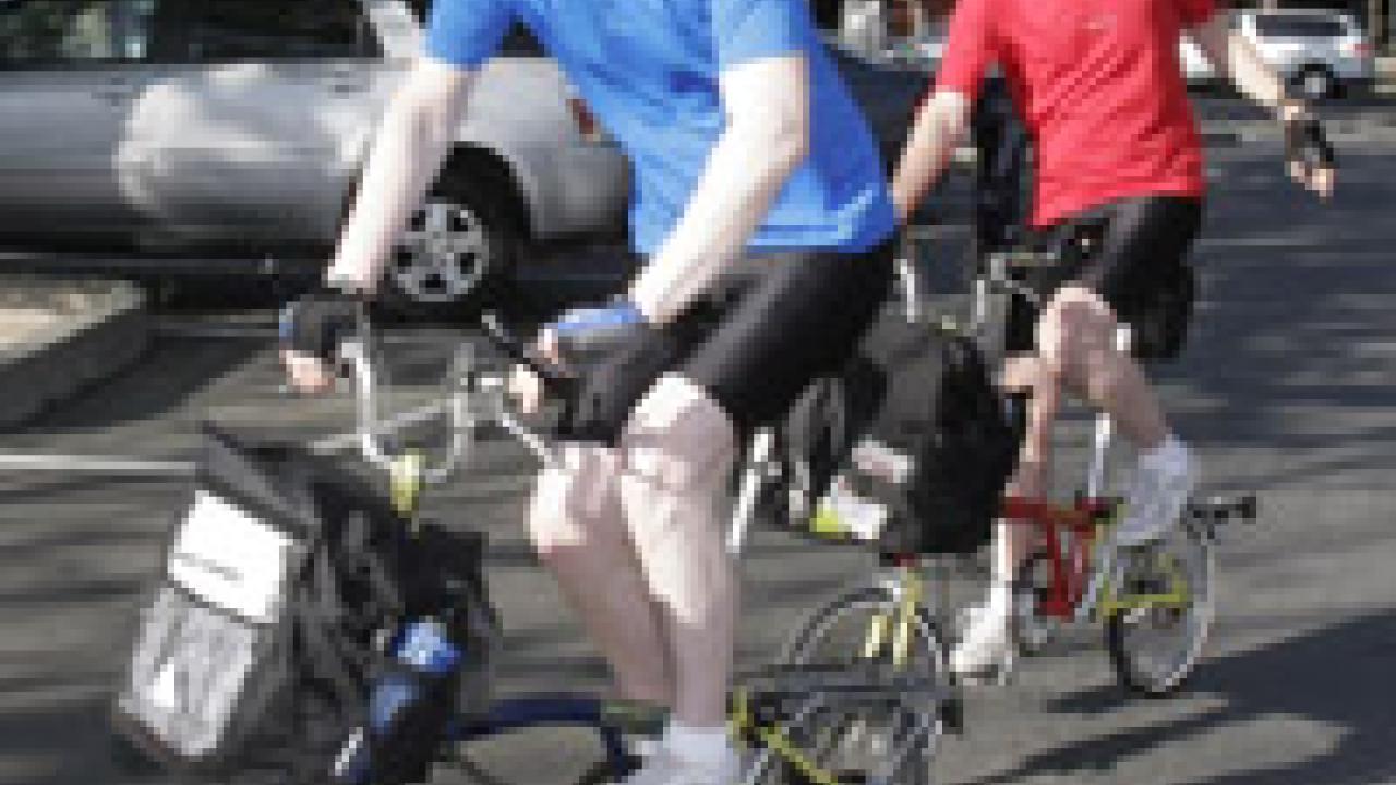 The Davis Enterprise calls them “cycling criers”—Gregg Whelan and Gary Winters (kneeling)—who are taking daily rides around town, for 30 consecutive days, interacting with the community, and concluding each day with a free, live performance piece at 5:30 p.m. at downtown’s E Street Plaza. Whelan and Winters call themselves Lone Twin, and their show here is titled To the Century, presented by the Mondavi Center for the Performing Arts as a UC Davis Centennial event. Each evening performance builds on the previous performances, through the finale at 5:30 p.m. April 18 (Picnic Day). Follow Lone Twin online: tothecentury.mondaviarts.org.