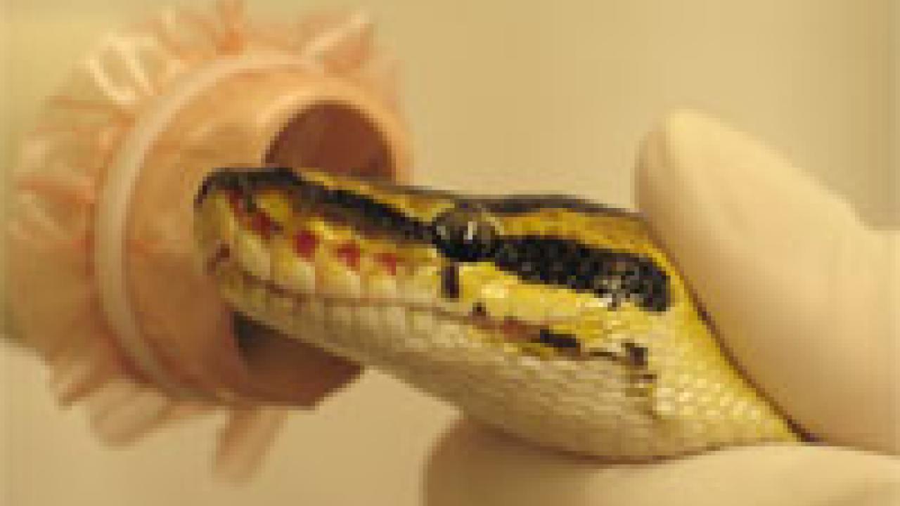 Faculty, residents and students at the School of Veterinary Medicine spent Saturday making the first high-frequency ultrasound studies of the structures in snake eyes. Led by the director of the school’s ophthalmology service, Stephen Hollingsworth, in the dark shirt, the team imaged the eyes of about a dozen snakes, including this ball python, right. Their findings should help veterinarians provide better medical care to snakes with eye injuries or diseases. Performing the ultrasound are veterinary medicine residents Brad Holmberg, left, and Anneliese Strunk, and student Leann Sickafoose.