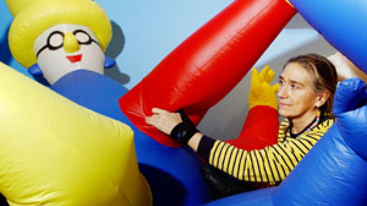 Sculptor and performance artist Pat Oleszko helps her new inflatable art exhibit take flight inside the campus's Nelson Gallery. The Air Apparent: My Military Industrial Complex will run to March 12. Oleszko is known for her prolific use of puns to lift up social issues. Since the opening of her show, she has been teaching about 15 students in a cross-disciplinary directed study. Under her tutelage, students have been making sculptures and costumes that pay homage to the Eggheads. Their show, Pat Oleszko's Egg-cellent Add-venture, is expected to be unveiled from noon to 2 p.m. today in the Walker Hall and Quad areas.