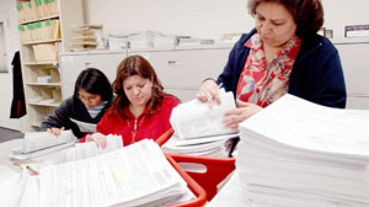 Campus employees have been working hard to process some of the more than 39,000 total applications received this year from students wanting to attend UC Davis in the fall 2004. After the applications are sorted and screened for data correctness, they are forwarded to the about 100 professional readers in undergraduate admissions and academic and student service units on campus. Since December, trained, professional readers on campus have been offering a comprehensive review of each freshman application — assessing academic and personal accomplishments in the context in which they were achieved. UC Davis plans to notify all applicants in mid-March about whether or not they were accepted. UC Davis last year extended offers of admission to about 57 percent of the freshman who applied, compared to 24 percent at UCLA and UC Berkeley. Given proposed budget cuts, the UC system may need to cut admission offers by 10 percent. Historically, about 26 percent of the students who are offered admission to UC Davis actually enroll. Pictured are Kay Myat and Cherri Meedel and operations manager of Undergraduate Admissions Pat Ramirez.