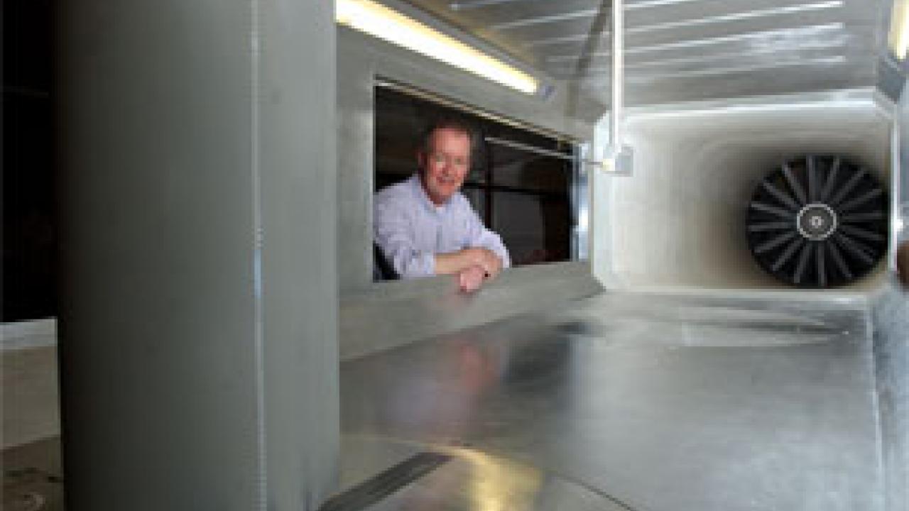 Winds greater than 100 miles per hour are more common in the Bainer Hall Courtyard than one would think. The area is not an F3 tornado breeding ground though -- it is the home of the campus Aeronautical Wind Tunnel. Installed in 1997, the AWT uses a 125-horsepower motor to produce a maximum velocity of 165 mph within a 2.8-by-4-foot chamber. UC Davis is one of two UC campuses, along with UCLA, to have an AWT of such size. Faculty and students in mechanical and aeronautical engineering use the tunnel for research, and Case van Dam, above, teaches a graduate course that also utilizes the tunnel. Current research projects include testing airfoils used for advanced wind turbine blades, but the AWT has other work ahead of it. "We are gearing up for several experiments in support of wind energy research funded by the U.S Department of Energy," said van Dam, who oversees the machine.