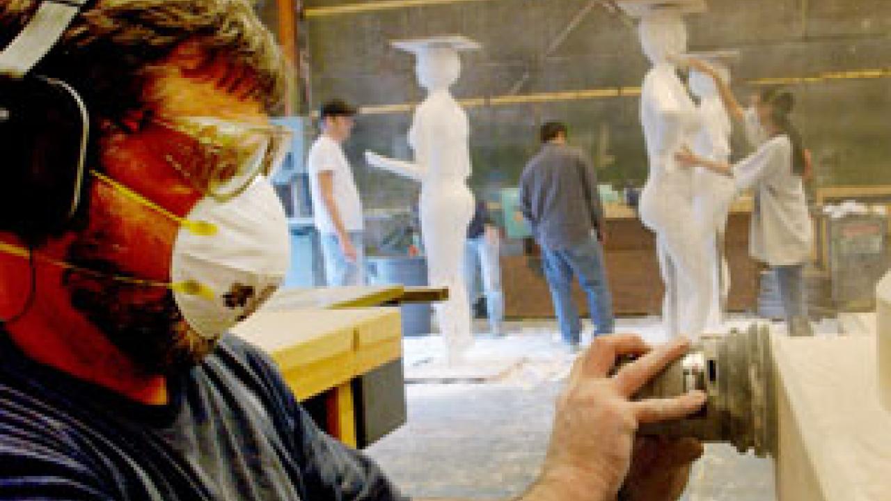 Property master Byron Rudrow of theatre and dance sands a Grecian pedestal for the campus production of Charles Mee's "Big Love." The show opened Thursday in the Main Theatre and runs through March 14. The award-winning play follows the plight of 50 women who reject their arranged marriages and flee to an Italian villa, with their would-be grooms in pursuit. It's a quirky, comic romp through gender politics that blends contemporary language and pop culture with ancient-Greece-inspired philosophical ponderings. Behind Rudrow students sculpt women out of plastic foam. The statues appear as columns that hold up a roof. Director Sheldon Deckelbaum says the statues aptly represent the position the play's female characters face of being "stuck between a rock and a hard place."