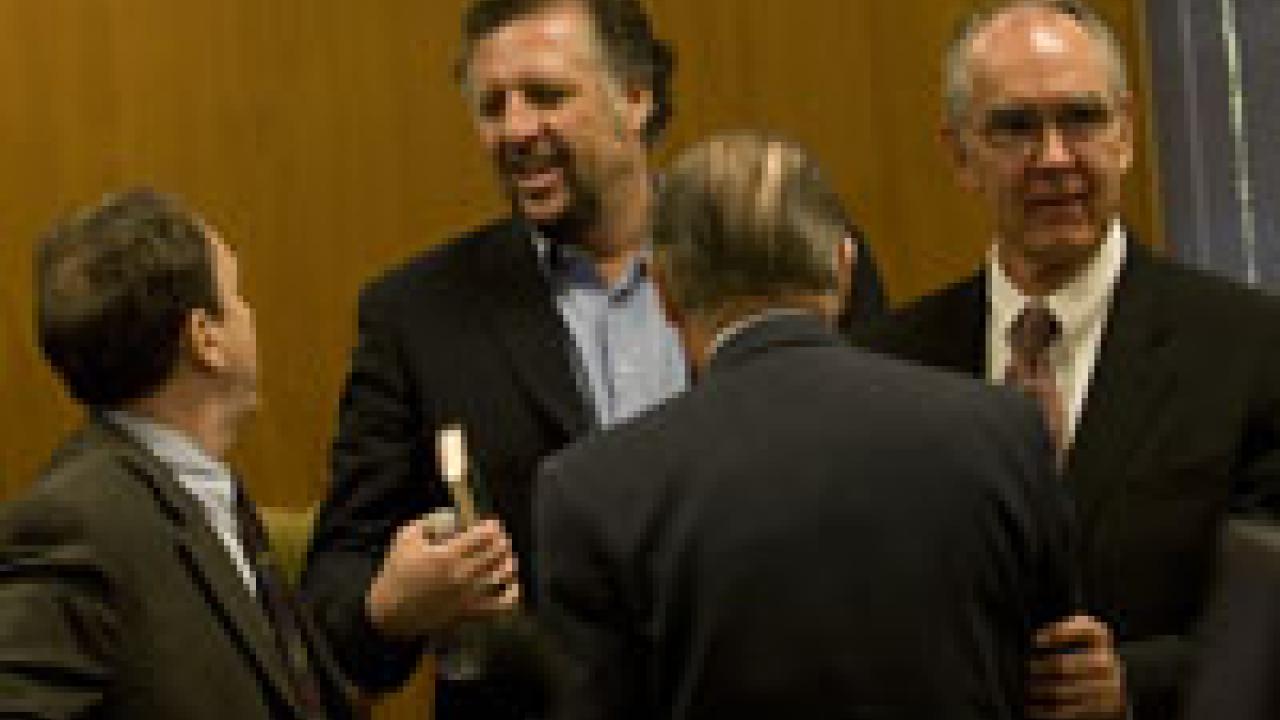 Sacramento Bee sports columnist Marcos Breton, second from the left, and state Court of Appeal Associate Justice George Nicholson, far right, spoke Monday in King Hall on the integration of Major League Baseball. The session was part of the law school's Cesar Chavez Week 2007, which included speakers on different topics from Monday through today. Sponsored by the La Raza Law Students Association, the Monday talk included discussion of Jackie Robinson's breaking the color barrier in 1947 as well as the ascent of Latino players in the game today.