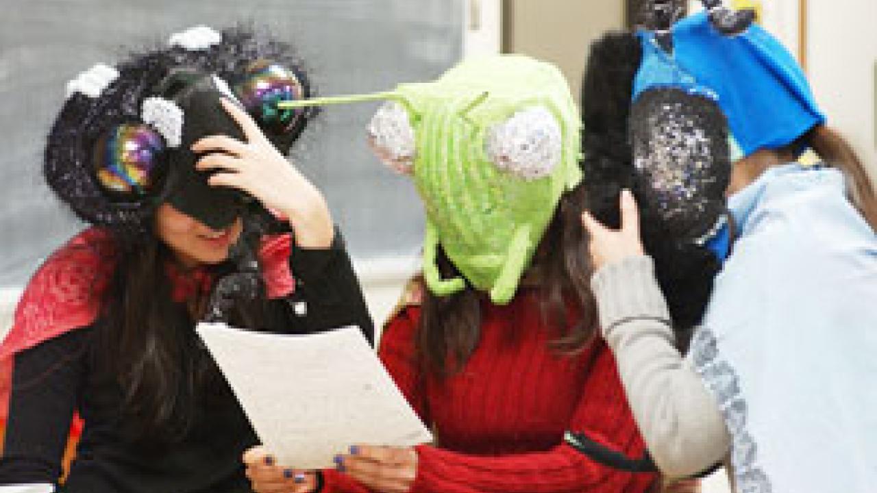 Briggs Hall looked like a scene out of "Star Wars" Dec. 4 as students donned scientifically-correct insect masks for a cross-disciplinary project in Professor Diane Ullman's Entomology I class: Art, Science and the World. Working in teams, students made masks and garments based on cultural themes like "insects in religion" or "insects in entertainment." Wearing their creations, they then offered informative and often humorous talks and skits on those themes, at right. Design professor Victoria Rivers and design TA Fauna Taylor helped consult on how to use textiles to mimmick nature's handiwork. Pictured on Dateline's home page, Diane Ullman talks with Vanessa Williamson about her Bogong moth mask.