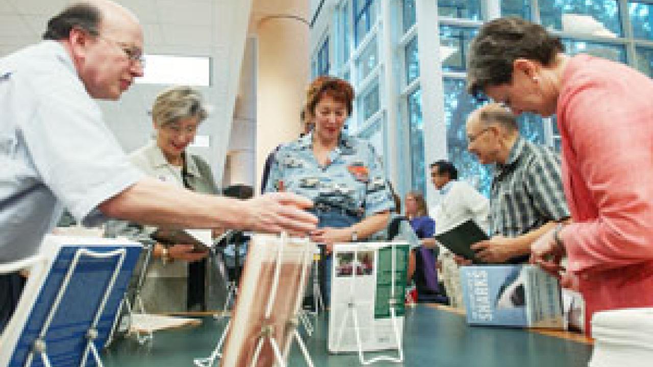 Book enthusiasts gather around a collection of works written by UC Davis faculty and academic appointees at the annual event for campus authors at Shields Library. The Oct. 28 event, which featured more than 120 newly published works, was co-sponsored by the General Library and the Bookstore. Provost and Executive Vice Chancellor Virginia Hinshaw underscored the importance of pursuing scholarly publications, and nearly a dozen authors addressed the about 50 people in attendance, talking about the inspirations behind their books. Peter Klimley, a researcher in wildlife, fish and conservation biology and author of The Secret Life of Sharks, amused the audience when he ripped off his T-shirt that displayed a ferocious looking shark to reveal a shirt underneath picturing a friendly looking shark. The entertaining exercise, he said, was meant to emphasize the point in his book that sharks are complex creatures and "picky feeders" -- not the relentless menace many people believe them to be. Pictured surveying books, from left, are: Law Library Director George Grossman, Provost Hinshaw, professor of comparative literature and German Gail Finney, professor emeritus of biology and agricultural engineering Bill Chancellor and head of the Health Sciences Library JoAnn Boorkman.