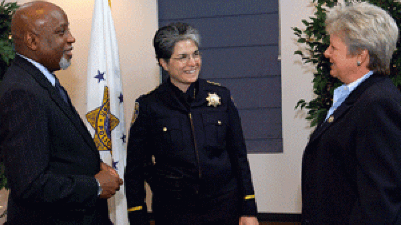 At her swearing-in ceremony, UC Davis police chief Annette Spicuzza, center, chats with prior Chief Calvin Handy and interim Chief Rita Spaur, who held the post after Handy left last fall. Spicuzza was sworn-in Tuesday at the Buehler Alumni and Visitors Center, becoming the first woman to receive a permanent appointment as police chief at UC Davis. Chancellor Larry Vanderhoef led Spicuzza in reciting the oath of office, and Spicuzza’s brother-in-law, UC Davis professor Glenn Young of Food Science and Technology, pinned on Spicuzza’s badge. Spicuzza has nearly 20 years of policing and administrative experience in municipal and university settings. She had been serving as assistant chief at the University of Washington since 2000.