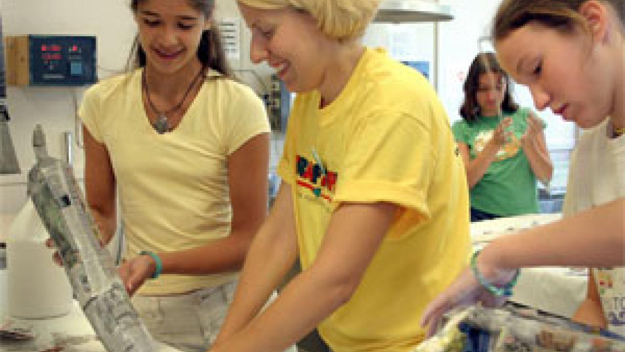Craft Center staff member Holly Whetstone helps Halli Hanson with a paper maché chili pepper Tuesday as the Craftopia camp program kicks off another season. The program will bring hundreds of children ages 8 and older to campus over the next eight weeks and offers activities, including ceramics, painting, fiber arts, jewelry, metal-working, screenprinting and woodworking. Campers work on their projects, eat lunch and then head to the Rec Pool. Many of the students involved have parents who work on campus, said Sue Barnes, director of the Craft Center. "(They) find our camps to be a great service, since their kids are right on campus during the day." See http://campusrecreation.ucdavis.edu.