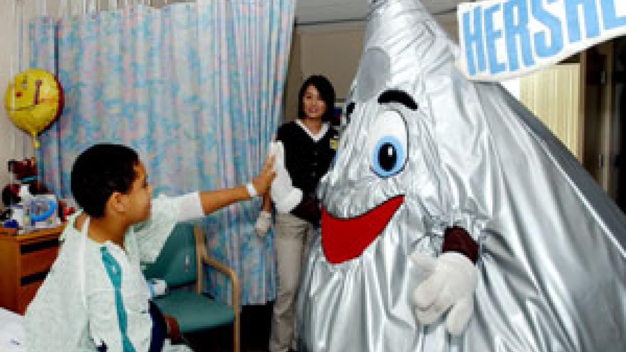 UC Davis Children's Hospital patient Sean Blue receives a "high four" from a four-fingered oversized Hershey's Kiss while Physical Medicine and Rehabilitation specialist Staci Cay watches. On Nov. 6, the 25-foot long "Kissmobile," left, and its anthropomorphized kiss visited the hospital to play games and take photos with patients and promote Children's Miracle Network. The Kissmobile is on a yearlong, 100-city tour of North America that began on Feb. 14. "Our young patients loved the visit," says Michelle Meher, CMN coordinator at the hospital. "It was a nice way to lift the spirits of some very sick children." CMN has raised $8 million for the UC Davis Children's Hospital through a series of fund raisers during the past 16 years, Meher said.