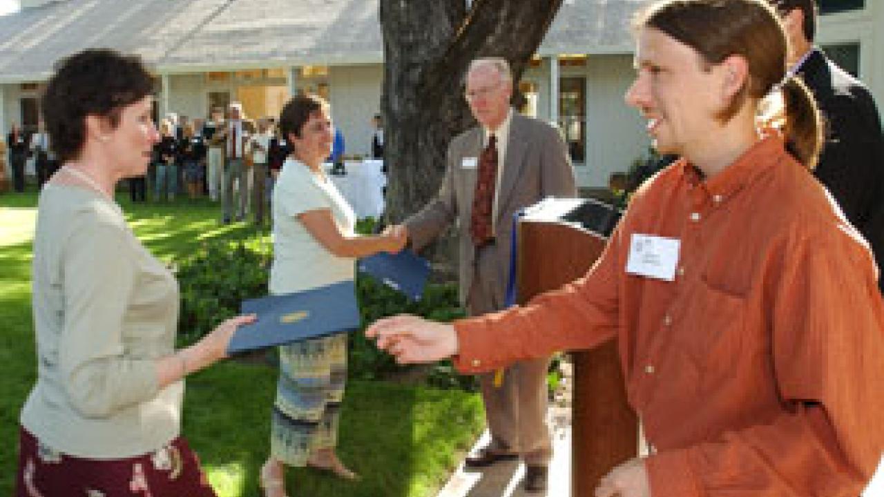 Richard Sutherland, right, and Chancellor Larry Vanderhoef, middle in background, congratulate psychology staff members Barbara Scoggins, left, and Tracey Pereida for receiving a Citation for Excellence Team Award for their general contributions to campus. More than 70 staff were recognized for their accomplishments individually and as members of teams during the May 5 reception at the Chancellor's Residence. "There is an enormous number of people at this university who do great things within their job descriptions," said Sutherland, chair of UC Davis Staff Assembly's Citations for Excellence committee. "We were looking for those who go above and beyond." Citations were given for general contributions, campus service and supervision. Honorees received further tribute during the TGFS picnic.