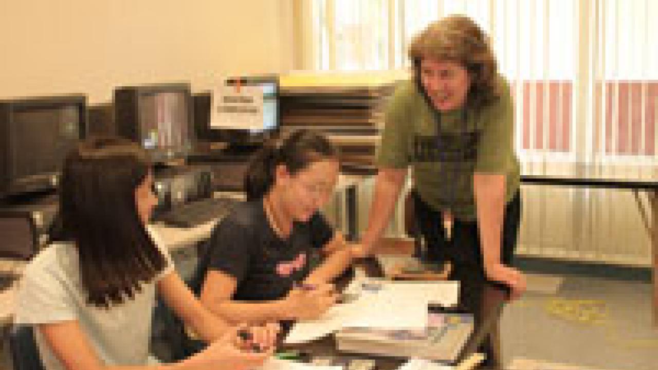 A large UC Davis team recently taught global warming to nearly every junior high science class in Davis. The project was organized by soil microbiologist Kate Scow, professor in the Department of Land, Air and Water Resources. Participants included more than 70 faculty and staff members, postdoctorate researchers, and graduate and undergraduate students from a wide range of disciplines. The presentations were a final outreach effort of the Kearney Foundation of Soil Science's five-year focus on soil carbon. On May 14, Scow discussed climate change with Holmes Junior High students Esther Koo, left, and Sonya Gao. After the presentations, students joined the team to estimate which of the schools had most reduced its "carbon footprint."