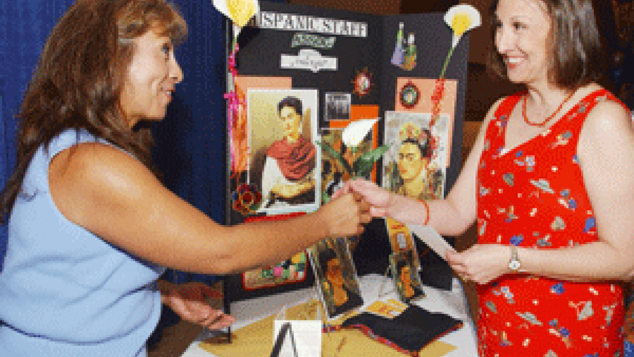 Julie Garcia of student affairs welcomes Barbara Ashby of human resources to the Hispanic Staff Association booth Tuesday during the Soaring to New Heights 12th annual celebration in Freeborn Hall. A week of events centered around the Principles of Community and disability pride comes to a close today with a big-screen showing of the animated film Finding Nemo, in which the title character is disabled, and a discussion about the general depiction of disability in movies. The program runs 11 a.m. to 1:30 p.m. in the Main Theater.