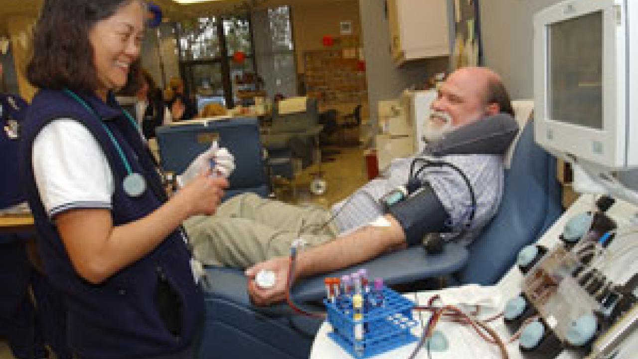 Michael Buck, right, chair of Staff Assembly, gets ready to donate blood in October as Patricia Wong from the blood bank prepares a machine that takes the blood and separates out the plasma and platelets and gives the whole blood back. Buck, who has an unusually high platelet count, can donate blood every two weeks and has made 400 blood donations in the amount of 50 gallons since 1989 when he first gave blood as a UC Davis student. He urges employees to consider giving blood at the ASUCD blood drive from 10 a.m. to 5:30 p.m. Nov. 16-17 at Freeborn Hall. "I am challenging the staff to match my 400 donations at the fall blood drive," said Buck. "Our blood drive is the largest in the area, but most of the donations come from students." The UC Davis blood drives typically collect about 3,400 pints of blood a year, said Angela Tarricone of Blood Source. "These contributions help us during critical times of the year, especially with the upcoming holidays," she added. Participants will receive a free T-shirt. For details, visit http://www.bloodsource.org.