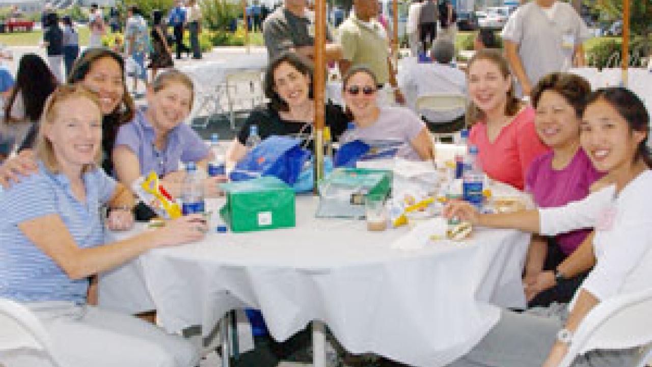 On May 26, more than 5,500 employees from the medical center campus came together for a picnic lunch and carnival-themed events, including batting cages, miniature train rides and chances to dunk managers and supervisors. From left, Laura Dobosz, Jackie Mah, Michelle Bauer, Karen Combrink, Trisha Eastman, Megan Barber, all of Physical Medicine and Rehabilitation, and others enjoy the Thank Goodness for Staff picnic at the Medical Center. Dunk tank dunkees included Tony Gould of distribution and stores, who donned a chicken costume to add to the festivity of the day. The costume at least provided him with a good excuse for leaving at the end of a double shift at the tank, Gould said. "I told folks I had an interview with Foster Farms I had to go to." Other dunkees included Duane Hicks of Parking and Transportation Services, Marty Gothard of Food and Nutrition Services, Dennis Curry of Plant Operations and Maintenance, and Veronica Esparza and Pete Petersen of Information Services.