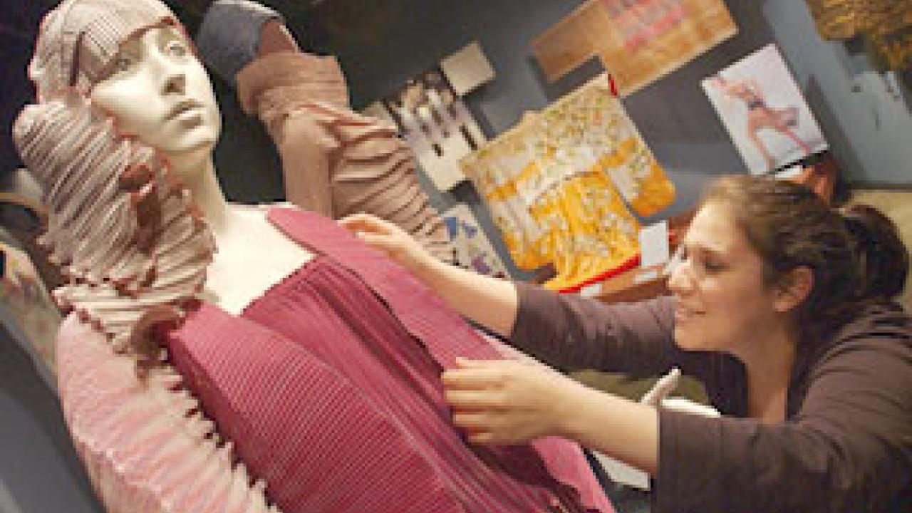 Third year UC Davis design major Rebecca Knopf adjusts fabric on a model in the new campus exhibition Fashion's Memory: From Peasant Art to Wearable Art, which opened in mid-May in the Design Museum, 145 Walker Hall. The exhibition, featuring costumes and wearable art garments, is scheduled to travel to Saint Martins College of Art and Design in London, England, in 2005. Works by international designers and top American wearable artists are displayed.
