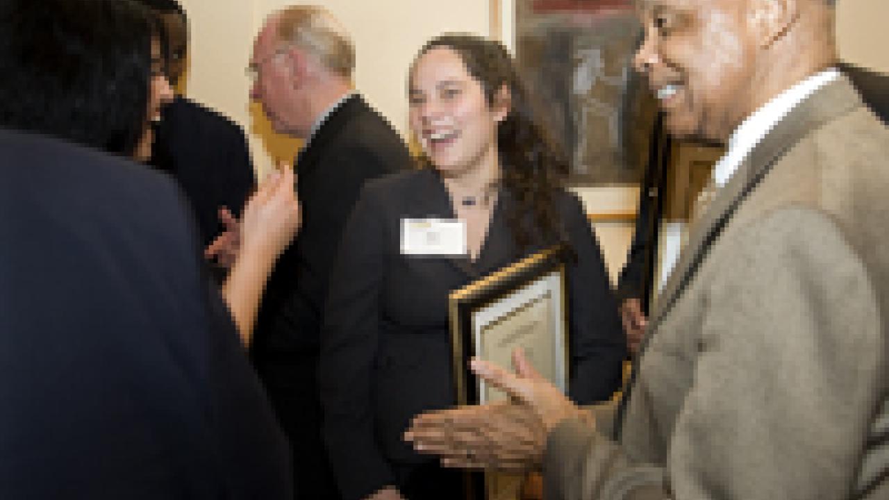 Native American studies graduate student Brook Colley, center, shares a laugh with fellow award winners at the Chancellor’s Achievement Awards for Diversity and Community on Jan. 29. The ceremony recognized people who, organizers say, contributed in “substantial ways to the development and well-being of our diverse and evolving community.” Chancellor Larry Vanderhoef is to the left of Colley. The other 2009 recipients: Steven Baissa, Cross Cultural Center, staff award; William Lee, publisher of the Sacramento Observer, community award; law professor Bill Ong Hing, Academic Senate award; student Parastoo Nina Massoumi, undergraduate student award; physician Jose Morfin, Academic Federation award; and medical student Ari Zadel, graduate student award.