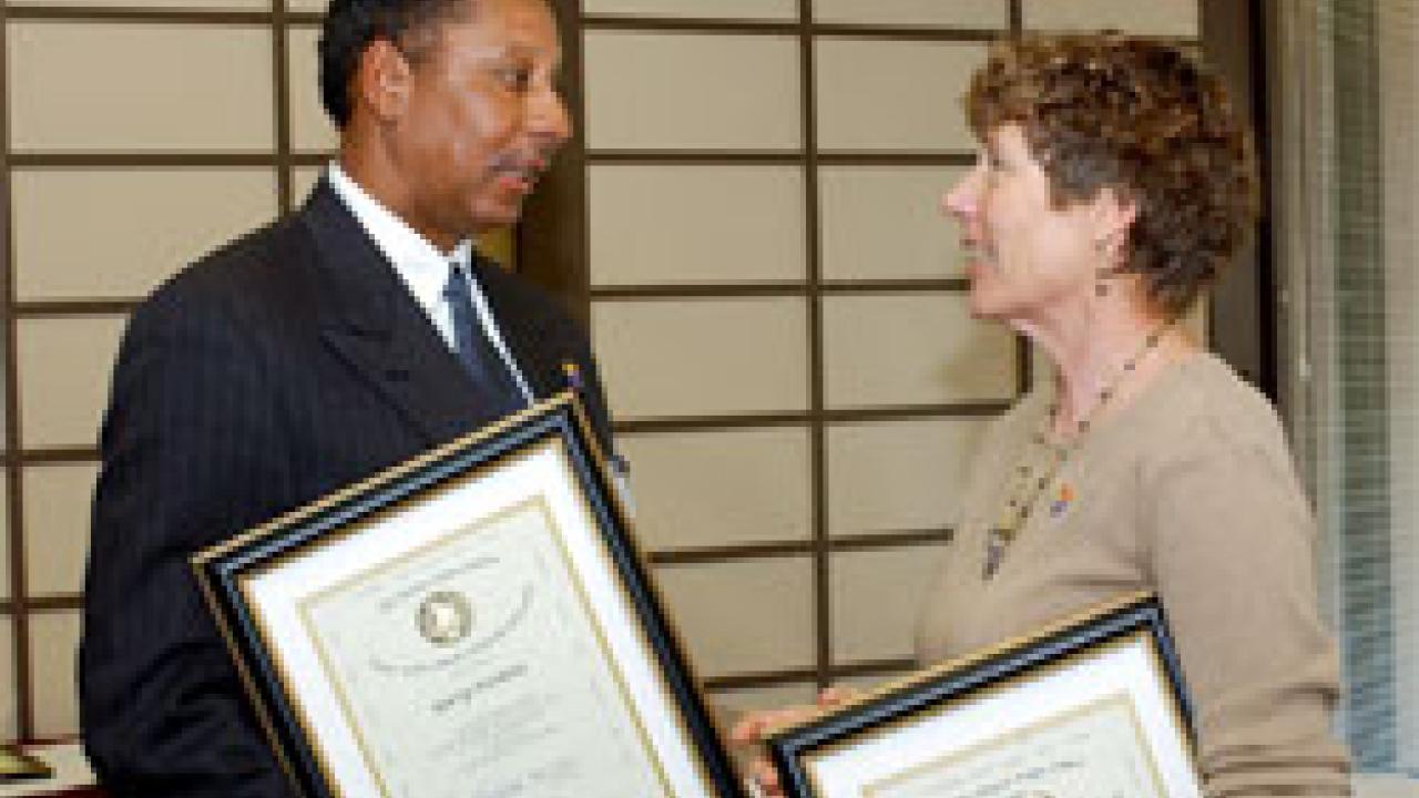 Women's Resources and Research Center librarian Joy Fergoda, right, and Gary Perkins, interim director of the Cross Cultural Center, talk after receiving career achievement awards for diversity May 2 at a University Club reception. Six other individuals and a team also were honored — all had been announced on April 20 during the 13th annual Soaring to New Heights multicultural celebration in Freeborn Hall. Wilhelmina Cottman, Irene Day, Paula Driver Shimada and Daniel Steinhart also won awards; Student Housing's Residential Education Office took the department award; Micki Eagle won the Deanna Falge Award and David Van Leer earned a special citation.