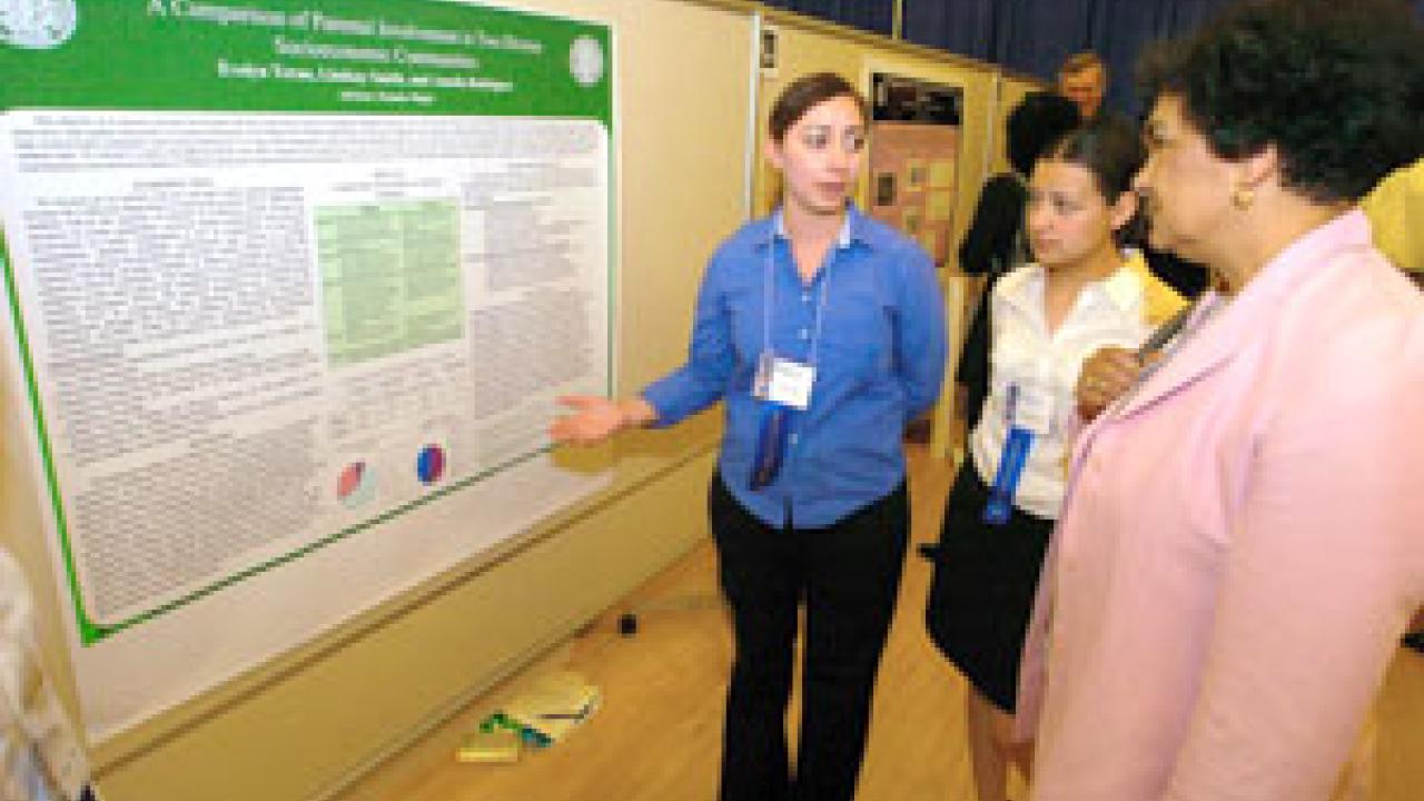 Senior psychology major Evelyn Teran, left, presents her team undergraduate research project to Assistant Vice Chancellor of Student Affairs Yvonne Marsh April 24 during the 15th annual Undergraduate Research Conference. More than 180 students presented work to the public -- orally and in poster format -- in Wellman and Freeborn Halls. The conference, one of the few in the UC system, is meant to encourage the development of research on all levels and across the disciplines. Teran and team members Lindsay Smith and Amelia Rodriguez researched the level of involvement of Latino parents in their children's elementary school. Other students presented such projects as "Entrainment of Rhesus Monkeys to the Martian Day" and "Random Walks with Tired Drunks." Chancellor Larry Vanderhoef delivered the keynote address during the event, presented by the offices of the provost and vice chancellor for student affairs. — By Mike Sintetos