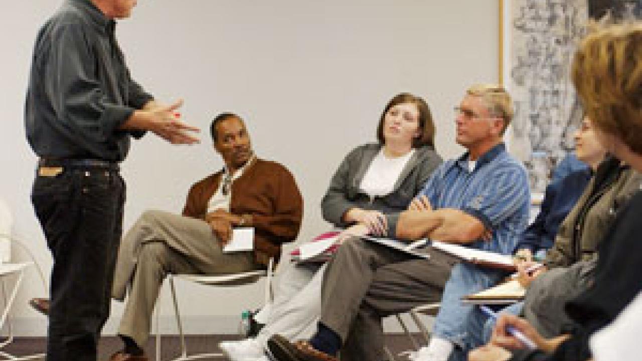 Author Mark Juergensmeyer, right, fields questions from UC Davis staff members at one of several Campus Community Book Project events held last week. Juergens-meyer's "Bring Your Own Conflict" brownbag focused on principles in his book, Gandhi's Way: A Handbook of Conflict Resolution. Juergensmeyer is a professor of sociology and religious studies at UC Santa Barbara. Karen Roth, diversity coordinator, says Juergensmeyer "inspired his audience to explore 'satyagraha,' which means interrogating the truth in both our own and our opponent's position when conflicts arise. This principle can be applied to every conflict ranging from international to personal disputes," Roth says. Book project programs themed around Gandhi's Way continue through Dec. 4. For details, visit http://occr.ucdavis.edu/bookproject.html.