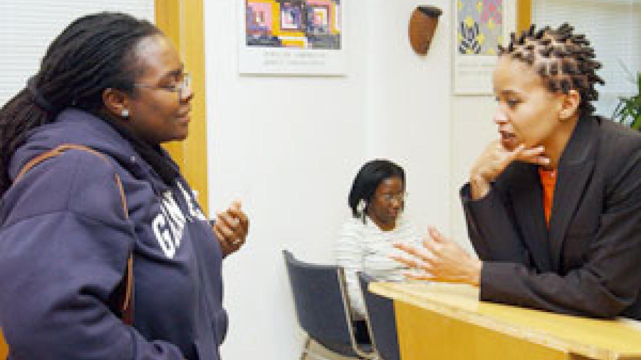 Assistant professor of American Studies Nicole Fleetwood, right, talks about the behavior of women in the cultural spotlight at Fleetwood's talk "Excess Flesh: Black Women Performing (Hyper) Visibility." The talk, part of a Black History Month lecture series, drew upon Fleetwood's studies of black female pop cultural figures who use explicit body performances in their practices -- looking at celebrities like Janet Jackson, for instance, and what she was trying to accomplish by exposing a breast during the Super Bowl, and how the public responds. The series concludes today at 12:10 in 2215 Hart Hall. Law professor Angela Onwuachi-Willig (shown talking to Fleetwood in the photo on this page) will address: "Just Another Brother On The Supreme Court: What Justice Clarence Thomas Teaches Us About Racism and Racial Identity." African American and African studies also will co-sponsor a talk Tuesday by assistant professor of history Lisa Materson. She will address how migration and church attendance helped African American women keep alive discussion about women's rights and equality after the Civil War from noon to 1 p.m. in the Garrison Room of the MU. Fleetwood is shown speaking with associate professor and director of the African American and African studies program Moradewun Adejunmobi on the March 5, 2004, Dateline homepage.