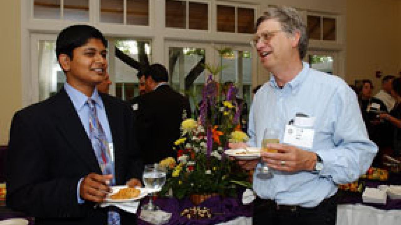 Faculty, students and administrators mingle May 18 during a reception held at the chancellor's residence honoring those involved in presenting freshman seminars. Spring 2005 seminars have included more than 75 wide-ranging courses, involving more than 80 instructors. Topics include: "The Book of Job," "Decision Making," "The Science of Baseball," "Weddings and Marriage in America," "Humphrey Bogart: The Greatest Actor of All Time?" and "The Embryonic Stem Cell Research Debate." At right, John Boe of English talks with student Havish Kota. Calls for proposals for the 2005-06 Freshman Seminar Program are due today. Interested faculty can visit the Teaching Resources Center Web site, http://trc.ucdavis.edu/trc/freshSem/call.html, or contact Janet Chambers at (530) 752-3249 or jachambers@ucdavis.edu. The seminars are designed to put a more personal touch on the learning process for students who are at the university for the first time. Faculty stipends of $1,500 to $2,000 are offered for teaching the one- and two-unit seminars.