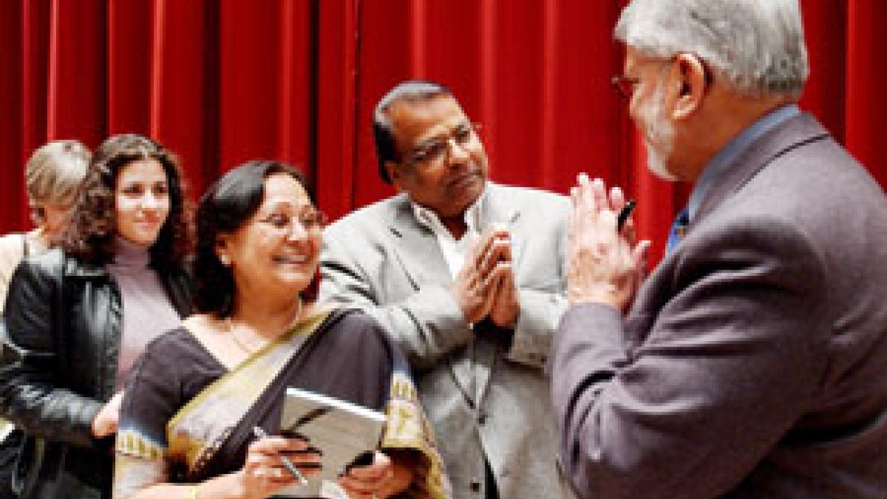 Mohandas Gandhi's grandson, Arun, greets Davis elementary school student Scott Pariek after speaking Monday in Freeborn Hall as part of ongoing Campus Community Book Project events. Arun founded the M.K. Gandhi Institute for Nonviolence. He told the audience to keep their thoughts positive, "for they become your words; your words positive, as they become your behavior." Behavior becomes habits and habits become values, he said. "And your values become your destiny." At right, Vimla Goyal of the cashier's office and her husband, Sham, of Agronomy and Range Science, greet Arun. At 6:30 and 9:45 p.m. tonight, the film Gandhi will be shown in Chemistry 194.