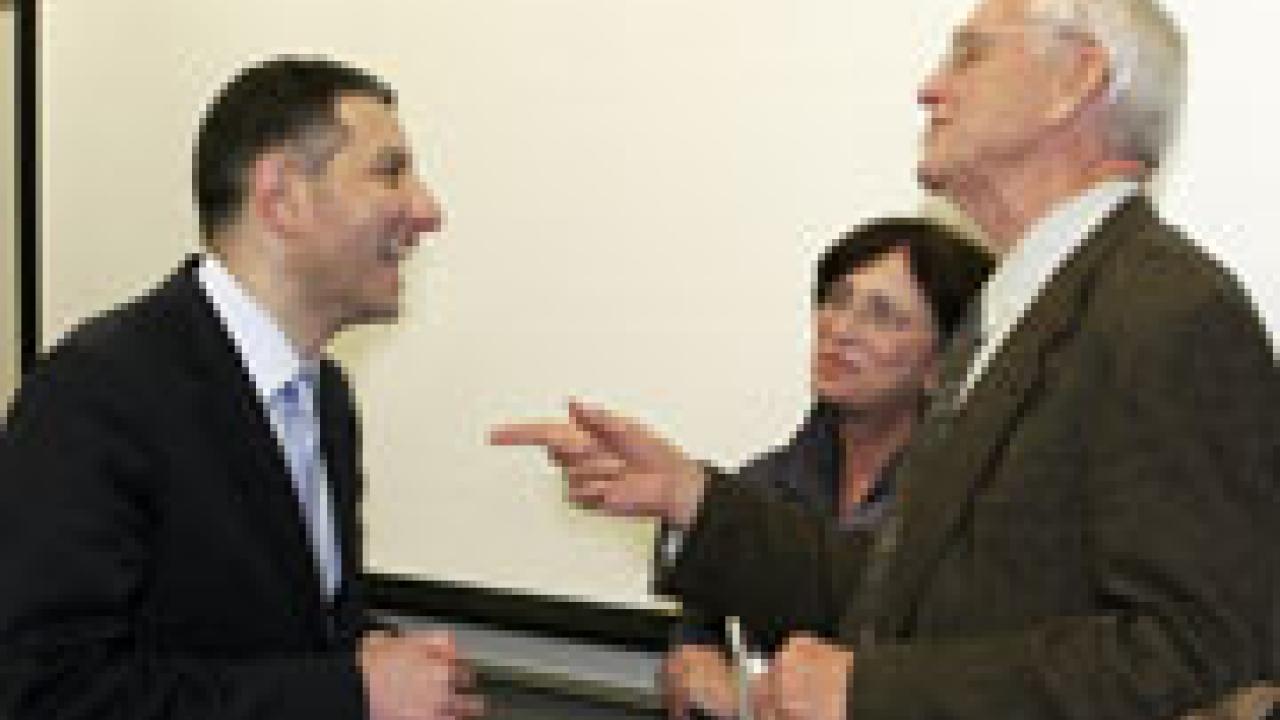 Prime Minister Zurab Noghaideli of Georgia, left, chats with Graduate School of Management Dean Nicole Woolsey Biggart, center, and Bob Medearis, founder of the Silicon Valley Bank and a member of the school's Dean's Advisory Council, during a campus visit on Dec. 6. Medearis brought Noghaideli to campus for an informal lecture on the economic, social and educational reforms that have occurred since Georgia's Rose Revolution, the peaceful 2003 coup that displaced President Eduard Shevardnadze.
