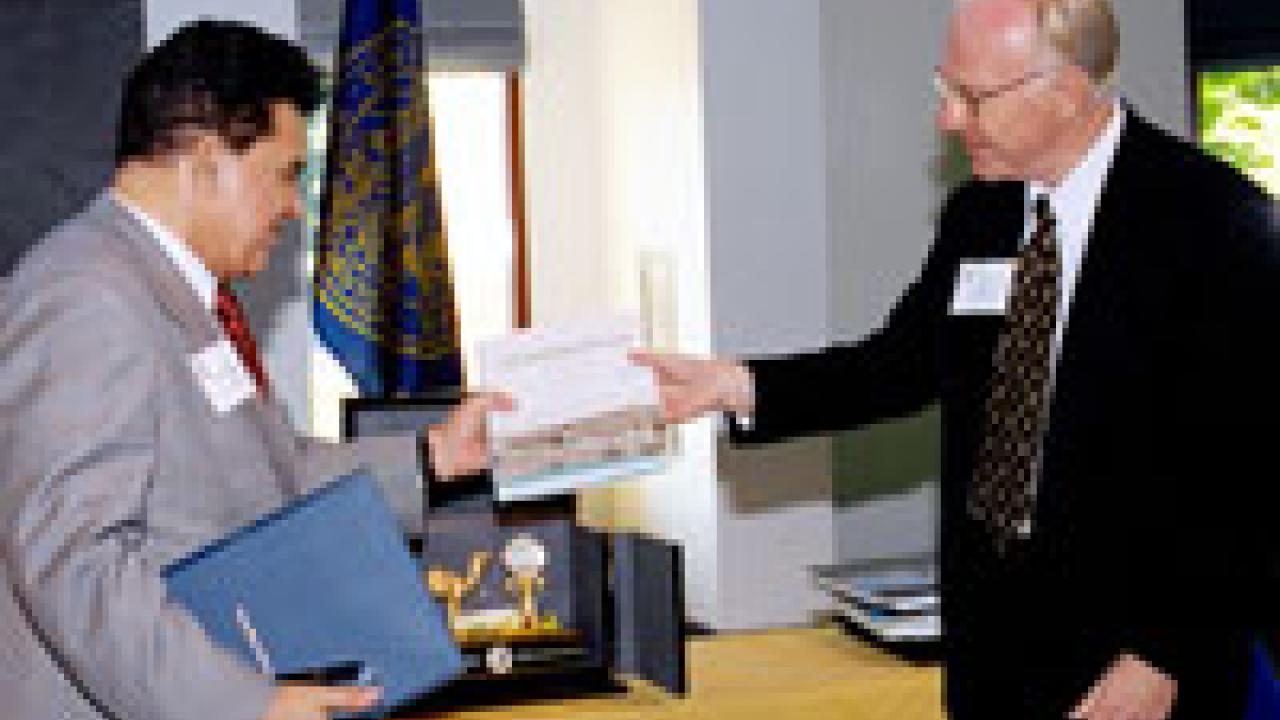 Abderrahman Khaleg, left, agricultural advisor to the president of the United Arab Emirates, and Chancellor Larry Vanderhoef exchange gifts Monday evening during a ceremony in the Alumni and Visitors Center. UC Davis and the United Arab Emirates initiated an agricultural research collaboration, focused on research related to salt-tolerant crops and other agricultural technologies developed in UC Davis' Department of Pomology. During an exchange of gifts, Vanderhoef presented Khaleg with the book Abundant Harvest, about the founding and development of UC Davis. In return, he received several books about the United Arab Emirates and a gold-and-marble clock featuring a camel and date palm, two of the UAE's most prized resources. UC Davis is a leader in research regarding crops that can be genetically modified for planting in areas that have salty irrigation water and salt-damaged soils.