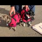 Volunteers present holiuday gift bags to two dogs.