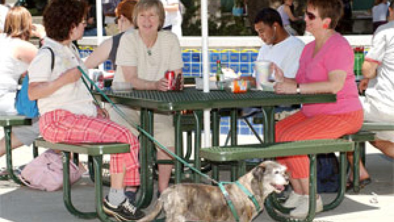 Warm, dry weather has finally arrived to stay, and spring quarter is rapidly coming to a close, drawing students and employees out for plein air relaxing and studying at the Quad and Silo gathering areas. Here, Ernie Garcia, left, and her dog, Candy, join former colleagues Janet Collins of Letters and Science and Mary Ann Smith of the registrar's office on the Coffeehouse patio. Garcia and Collins know something about home stretches — Garcia retired just last week, and Collins is set to retire July 1. Campus instruction ends June 8, and nine commencement ceremonies are slated between June 11 and June 19. For more details about commencement, see the story on Page 3.