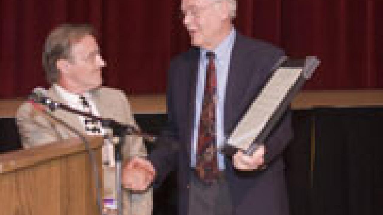 Dennis Shimek, right, senior associate vice chancellor for human resources, received a Special Board Resolution on May 9 for the many years of support he has given the campus's Administrative Management Group, or ADMAN. George Hague, a management services officer in chemistry and ADMAN chair, congratulates Shimek. ADMAN is a campus organization with a membership of about 125 that provides middle managers — commonly known as management service officers, or MSOs — a communication link among unit managers and the central campus administration. See adman.ucdavis.edu for more information.
