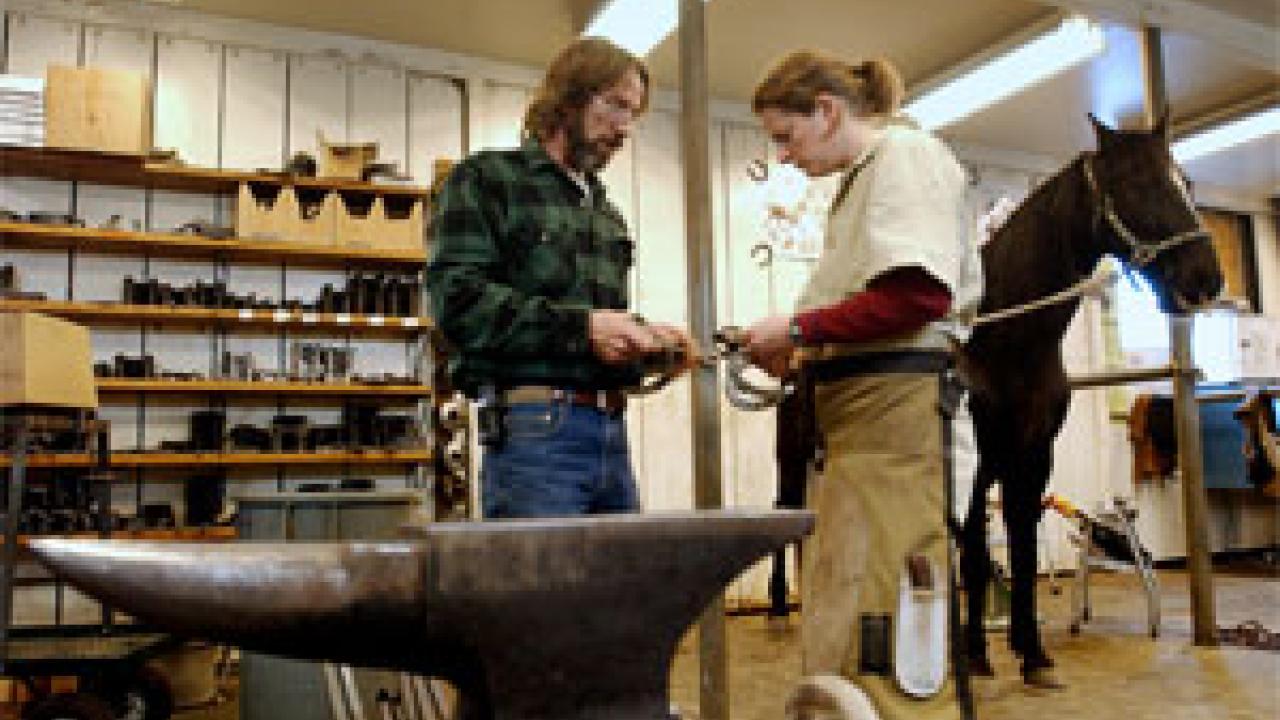 Senior campus farrier Bill Merfy makes preparations for shoeing a horse by looking at hoof ex-rays. Later, consulting as he does daily with clients, Merfy talks with veterinary medicine student Julie Irwin about what shoe type might be best for her horse, Shane, a Tennessee walking horse. Merfy and other employees at the farrier shop, consult with clients, veterinarians and x-rays, then work at the anvil -- making sparks fly -- as they custom-fit horseshoes. Located near the Equestrian Center toward the southwest edge of the main campus, the shop has provided equine footwear to Veterinary Medicine Teaching Hospital patients and the general public for more than 25 years. Merfy, who came to campus in 2002, mans the shop along with two other farriers. They spend anywhere from 20 minutes to four hours fitting a horse, and often will work on five or six steeds during the day. -- By Mike Sintetos
