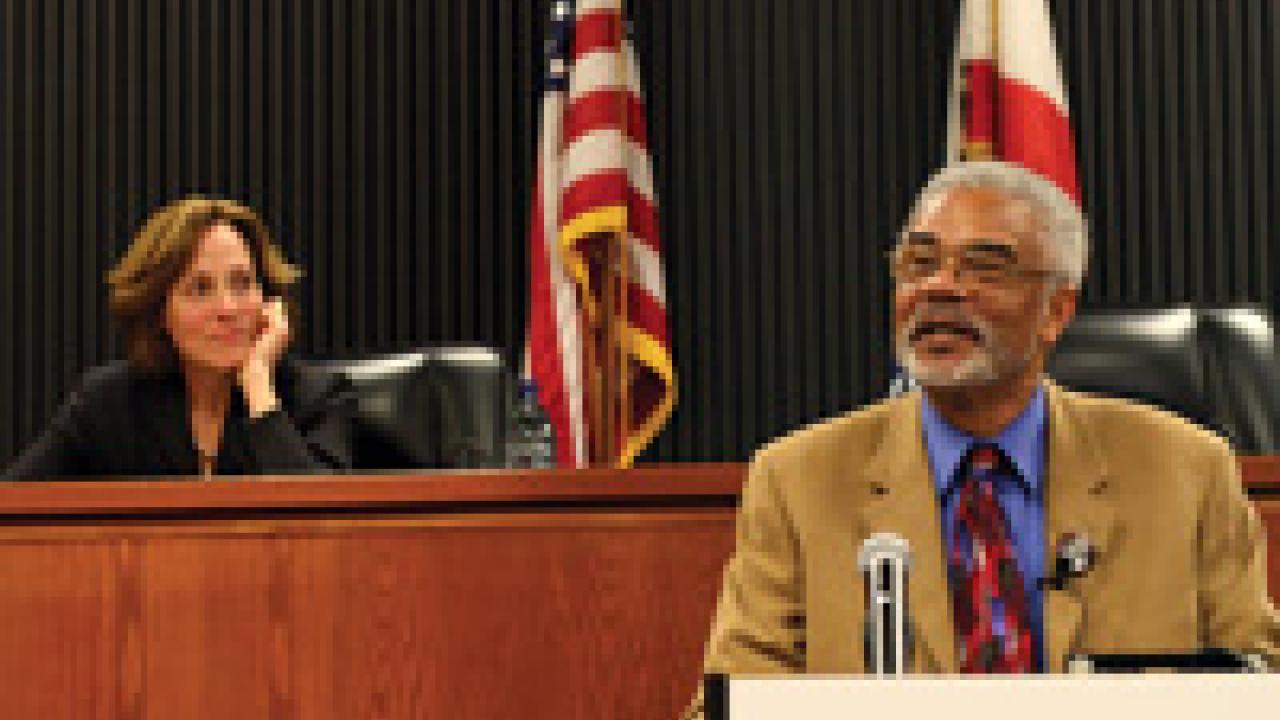 Diane Amann, law professor and director of the law school’s new California International Law Center at King Hall, looks on as Clayborne Carson from Stanford University speaks at the center’s inauguration on Feb. 4. Carson is the director of the Martin Luther King Jr. Research and Education Institute at Stanford. UC Davis’ California International Law Center will build on the tradition of international law scholarship by cultivating faculty, student and alumni work in this area. It will also offer a speakers’ series and curriculum and career development services.