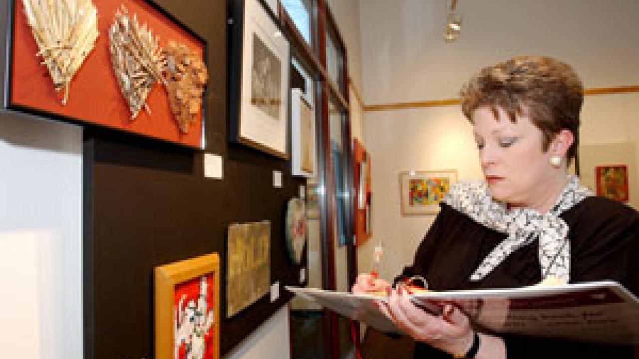 Artwork in the 11th annual Artists' Valentines show goes up for auction tonight in the Walter A. Buehler Alumni and Visitors Center. The approximately 100 pieces in the exhibit are available for purchase through a silent auction. A party and final bidding takes place tonight from 7 to 10 p.m. Carrie Parker, alumni center facilities manager, commented on the exhibit: "I like the variety, from the cute and sweet to the interesting and the dramatic." Pictured, Verena Young, director of development for Mondavi Center, examines artworks in the 11th Annual Artists' Valentines auction and exhibition.