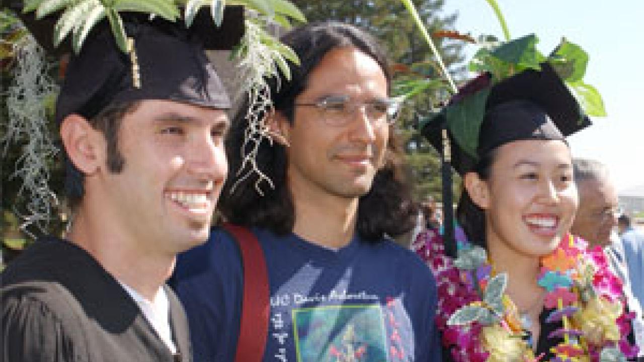 Pictured with staff research associate and curator of the UC Davis Botanical Conservatory, Ernesto Sandoval, plant biology graduates Belinda Ho and John Meuser propagate a tradition of affixing flora to their mortar boards during graduation. The two were among approximately 6,000 students to earn degrees this spring quarter. The majority of those students took part in the university's 12 commencement ceremonies, which ran May 22 through June 20. The campus conferred about 4,650 undergraduate, 330 master's, 285 doctoral and 550 professional degrees. In addition, 138 students were honored for completing studies for their teaching credentials. Dr. Julie Gerberding, director of the U.S. Centers for Disease Control and Prevention, and 9th district California assemblymember Darrell Steinberg, who is a graduate of the UC Davis School of Law, were among the guest speakers.