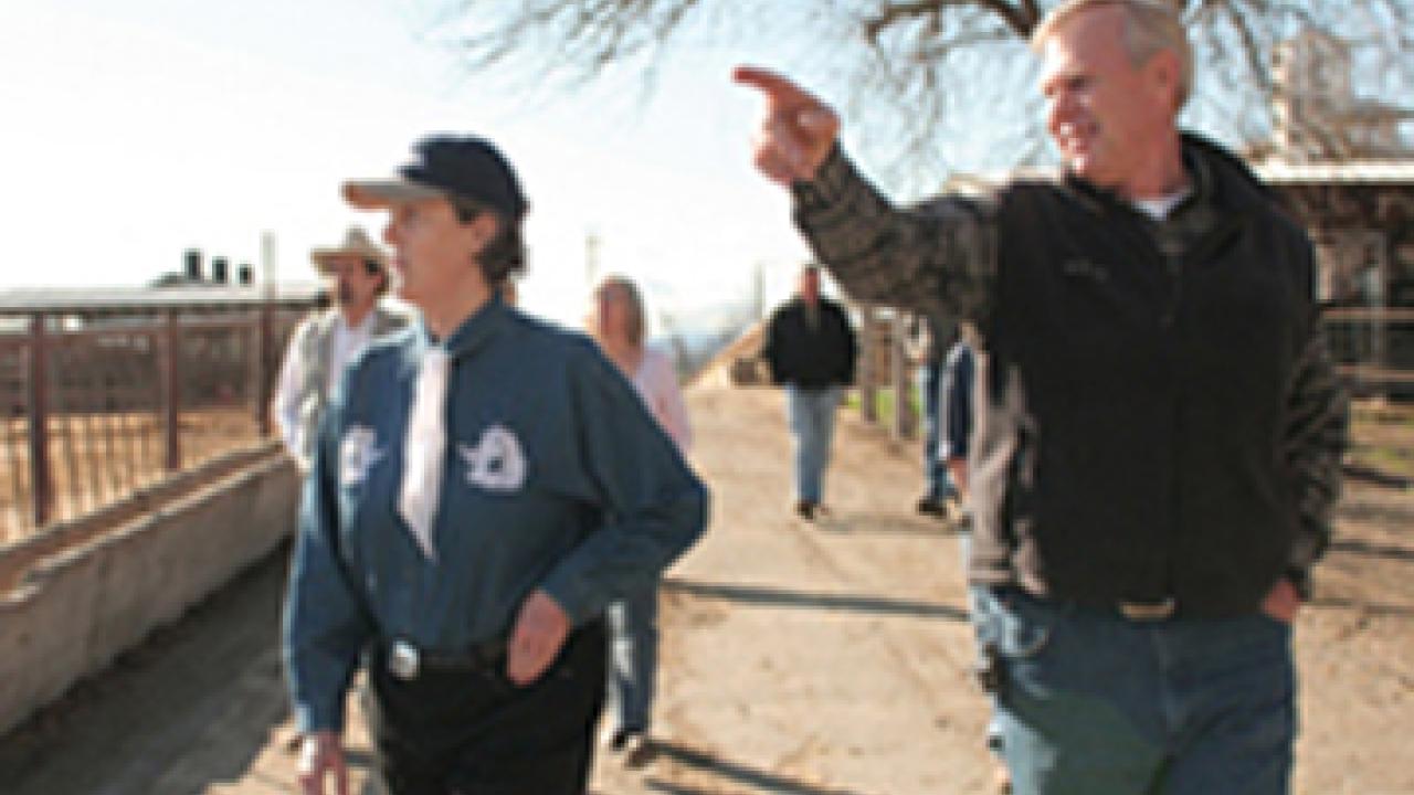 Colorado State University Professor Temple Grandin, an expert in animal behavior and livestock handling, toured UC Davis’ livestock facilities on Feb. 13, the day before she gave two talks on autism for the MIND Institute. She is pictured walking beside Gerald Johnson, beef cattle facility manager for the Department of Animal Science.
