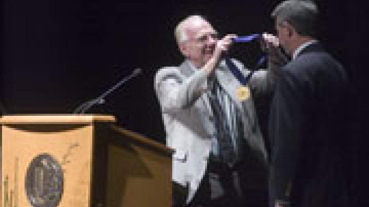 Chancellor Larry Vanderhoef places the UC Davis Medal around the neck of astronaut and UC Davis alumnus Steve Robinson in Mondavi Center on Dec. 4. The medal was given to Robinson in recognition of his contributions to the university and the broader community. Robinson was on campus to speak in the College of Engineering Dean’s Distinguished Lecture Series