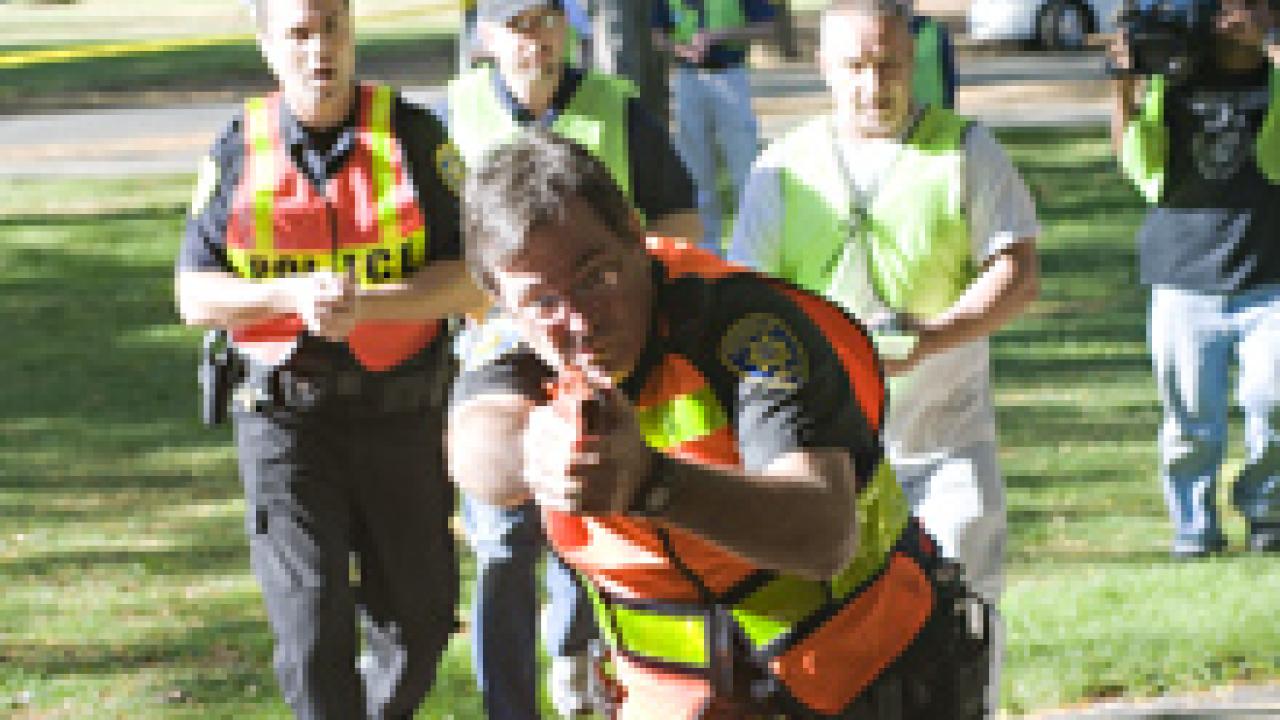Fake blood, an explosion and simulated gunfire were the highlights of Operation Gallant Eagle, a full-scale exercise by the UC Davis Police and Fire departments on Sept. 16. The goal—to test the response of these units to a major violent incident on campus. Officer Joe Wagstaff, center, and others respond to two ‘active shooters’ in the Food Science and Technology Building. Up to 200 volunteers and staff took part in the various training exercises that lasted throughout the day. To watch media coverage of this drill, visit http://www.kcra.com/video/20945336.