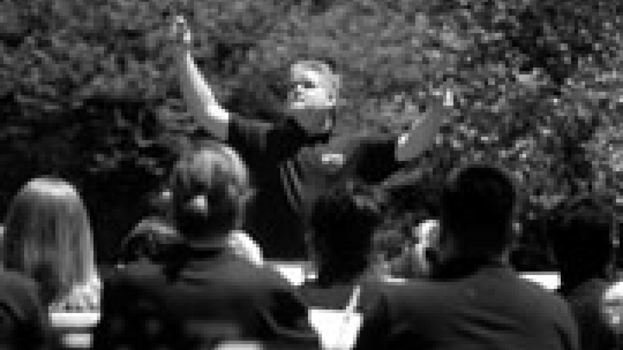 Pete Nowlen directs the University Concert Band and UC Davis Wind Ensemble at their annual noon concert May 24 on the Quad. The program featured works by Percy Grainger, Hector Berlioz and John Philip Sousa. The concert band, a fixture on the campus for more than 50 years, performs symphony classics and includes about 75 student members. The wind ensemble consists of 40 select members of the concert band. For more information on both groups, see musdra.ucdavis.edu/concertband/staff.htm.