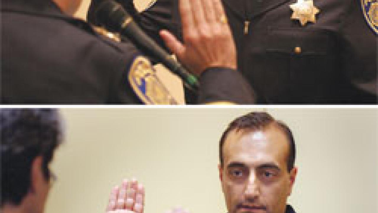 Sgts. John Johnson, top, and Nader Oweis of the UC Davis Police Department become Lts. Johnson and Oweis on July 8 during a swearing-in ceremony at the ARC. Johnson oversees patrol at the medical center, and Oweis is in charge of patrol on campus. Both Oweis and Johnson have been with the police department for 11 years. The unit employs 41 police officers, 10 public safety dispatchers, 28 career staff and more than 50 students.