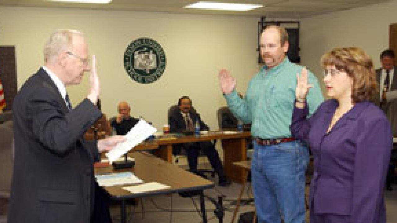 UC Davis employee Kim Poole and fellow new Dixon Unified School Board member Mike McCluskey are sworn in by Chancellor Larry Vanderhoef last month in Dixon. Poole, a receptionist with the Chancellor's and Provost's Office, is one of two UC Davis employees to on Nov. 4 win a seat on an area school board. The other, Keltie Jones, with the Student Disability Center, was elected to the Davis Unified School Board. Poole was sworn-in in December. She plans to emphasize collaboration between teachers, administrators and school-site personnel to help children excel. "It will be important to work together ... as we face impacts the state budget crisis will have on our district." Jones echoed Poole's concerns. "We will have tough choices to make due to the state budget reductions," she said. "But I'm committed to finding ways to reduce costs with minimal direct impact on students."