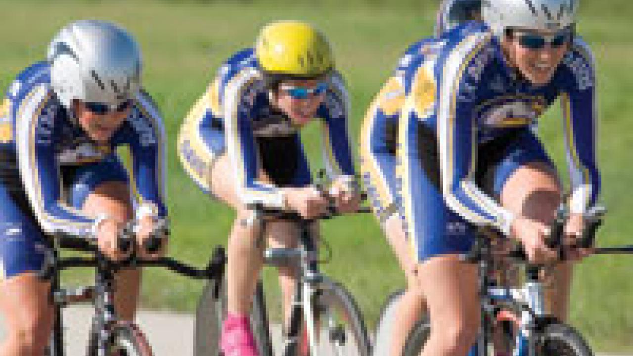 The UC Davis Cycling Club finished second to Stanford in the Division I Team Competition of the 2007 National Collegiate Cycling Championship last weekend in Lawrence, Kan. UC Davis won the team title in 2006. From left, students Amy Encalada, Jamima Illey and Marisa McAdler Encalada finished the 20-kilometer team time trial race in 27 minutes 29 seconds, only 8.6 seconds behind the winning squad from Fort Lewis College (Colo.), good enough for a silver medal. Student Tyler Dibble finished eighth in the 84-mile road race and second in the 65-minute criterium en route to a silver medal in the men's individual omnium. More than 500 student-athletes from across the country participated in the annual competition.