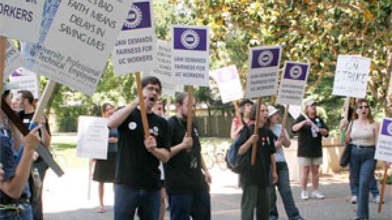 Picketers gather outside Mrak Hall on May 26 during a planned University Professional and Technical Employees strike that included representatives from the American Federation of Teachers and the American Federation of State, County and Municipal Employees unions. The university has been negotiating a contract with UPTE — which represents 10,000 UC employees — since May 2004. There are 1,666 technical and research employees at UC Davis represented by UPTE. About 50 people participated in the strike, with picketers visiting a half dozen campus sites.