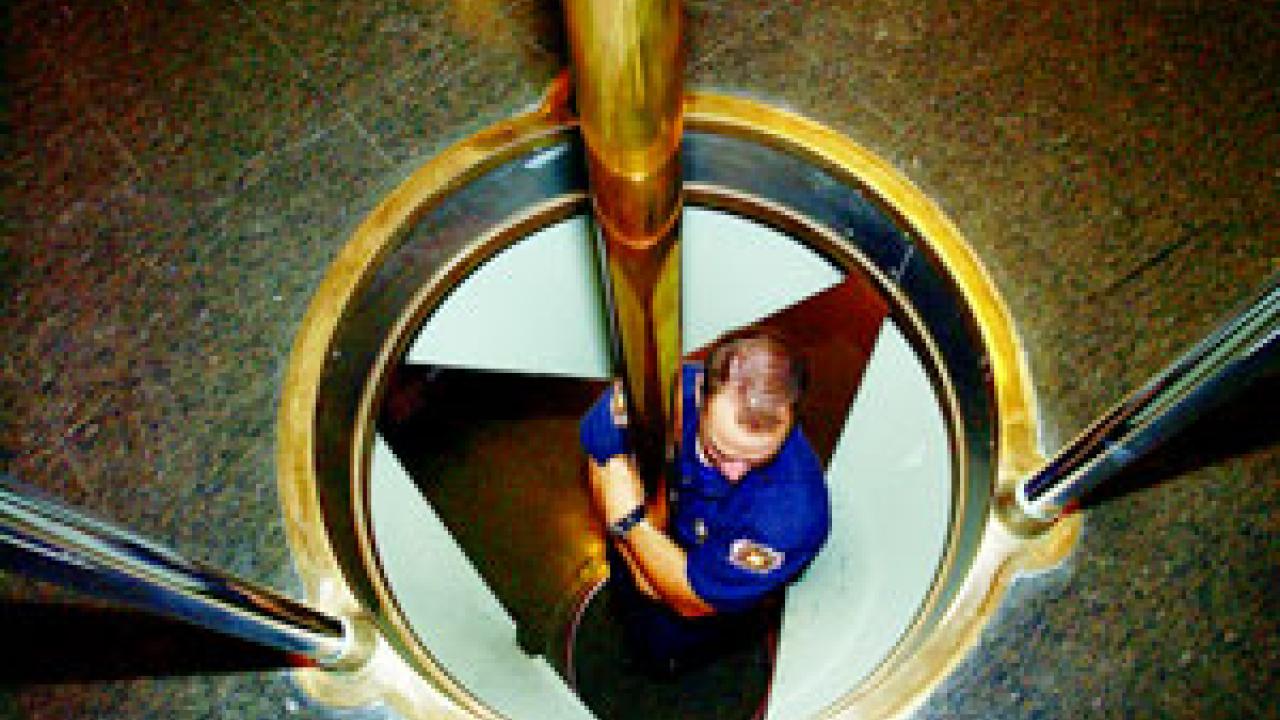 Firefighter Kevin Cullison slides down the pole in the UC Davis Fire Department. The weight of the descending firefighter opens the triangle-shaped hatch. The brass pole was a new and welcome feature of the fire building when it opened in 1977. Firefighters previously worked out of a one-story building across Hutchison Drive from Sproul Hall. Even in the newer building, career firefighters bunk on the first floor, but during one of the first calls in the building a firefighter actually ran upstairs so he could slide down the pole, says Fire Capt. Tony Rossetto. Student firefighters live on the second floor and always take the pole, Rossetto says. And the apparatus also accommodates a visitor from the North Pole each December at the fire station’s annual holiday party. Children traditionally gather at the base of the pole and chant together for the arrival of Santa, who eventually makes his grand entry how else? — down the pole, of course.