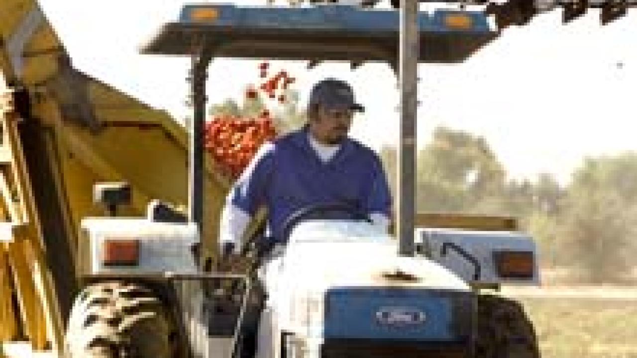 Andres Bermudez Jr., a field technician for UC Davis, drives a tractor receiving a load of freshly picked tomatoes at the Russell Ranch Sustainable Agriculture Facility on Oct. 1. Organizers estimated that about 550 tons of tomatoes were amassed during four days of machine harvesting. Some tomatoes will go to support the research at Russell Ranch and others will be gleaned for non-profit organizations and food banks in the area, according to Emma Torbert, a post-graduate fellow working on Russell Ranch, which conducts long-term research on the sustainability of different crops. More information: russellranch.ucdavis.edu.